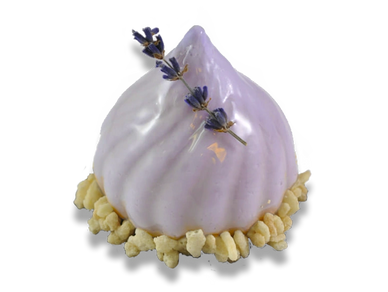 Coconut/lychee and raspberry coulis, ube cream, lychee whipped ganache, almond chocolate glaze